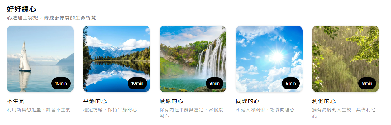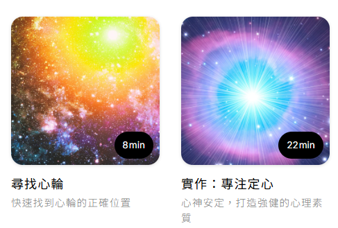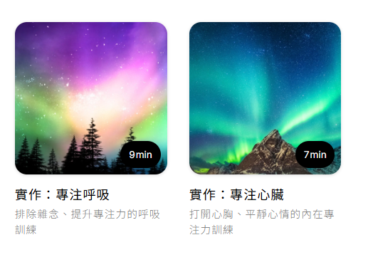搭配由專業的舊金山藝術大學電影配樂碩士 音樂總監所設計的冥想音樂,讓我們可以隨時在各種情境下,跟隨引導即可體驗到放鬆的感覺。